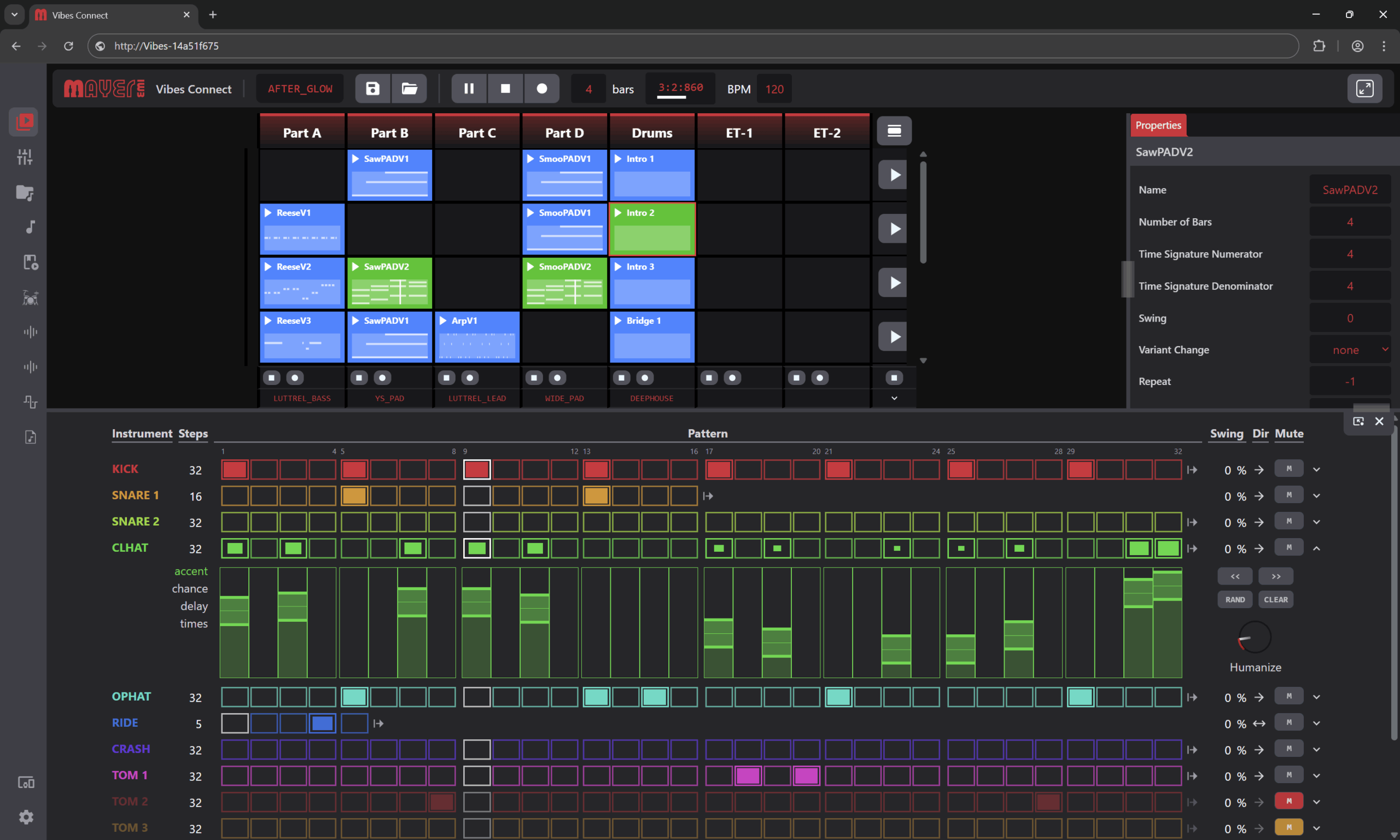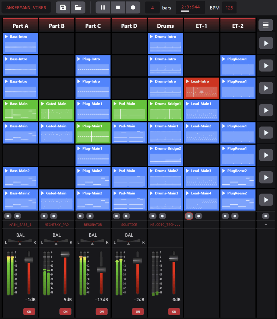 The Clip Launcher is the perfect way to arrange your MIDI Loops or Drum Sequences or even external sound gear. Just drag a MIDI file to import note sequences or start afresh with the Note Editor. Start the clips together in Scenes or individually. Automate transistions or control them by yourself in the browser, on your synth or even with a Launch Controller. Additionally you have two tracks to even sequence external gear via MIDI. This gives you full control not only over your Vibes but also over your whole setup.
