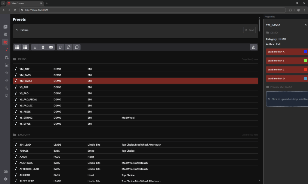 Directly accessible via the Browser, VibesConnect turns your powerful stereo Synthesizer into a Synth Station. Simply plug an Ethernet cable or connect via Wifi and use the powerful web interface VibesConnect. No downloads, no installation, no drivers needed, it turns your computer or tablet to an extended interface to your Vibes. Use the comfort of a DAW like workflow with the independence and mobility of a Desktop Synthesizer. That is what we call a Synth Station.